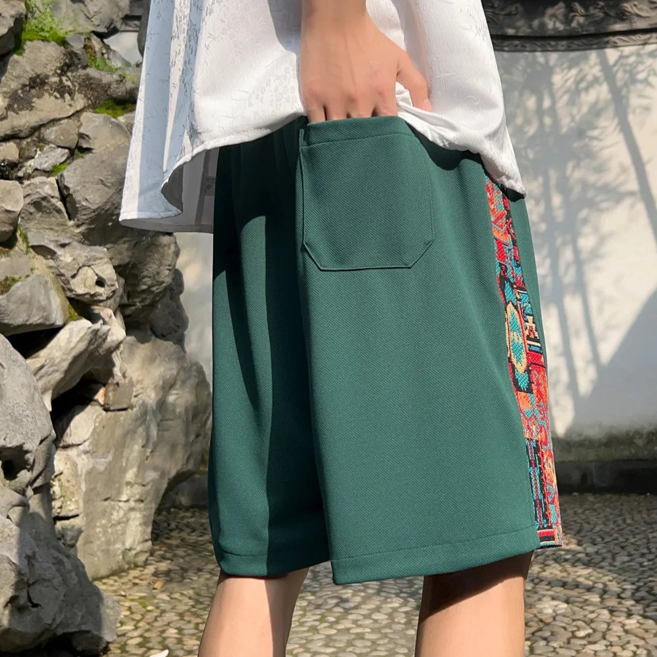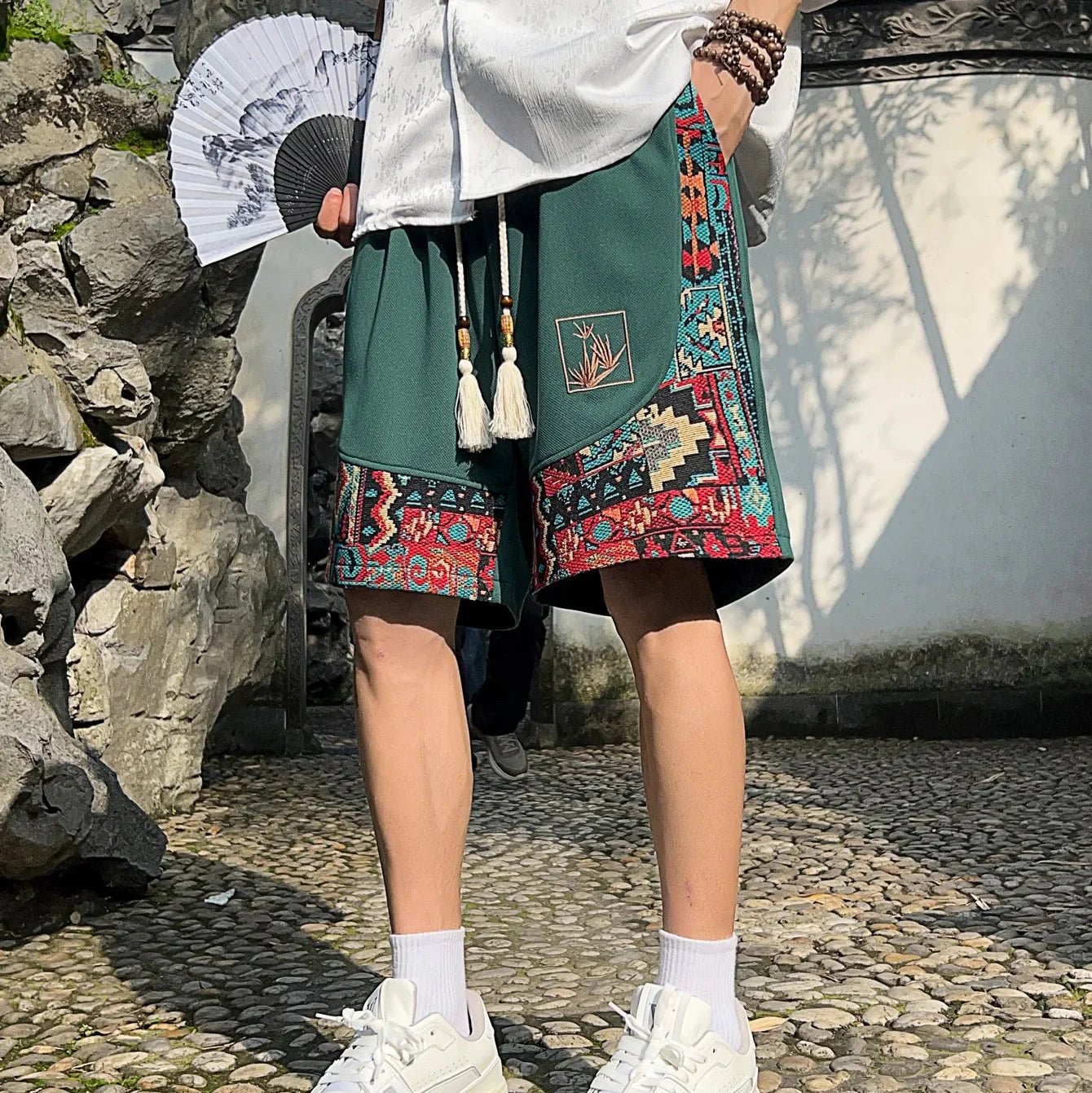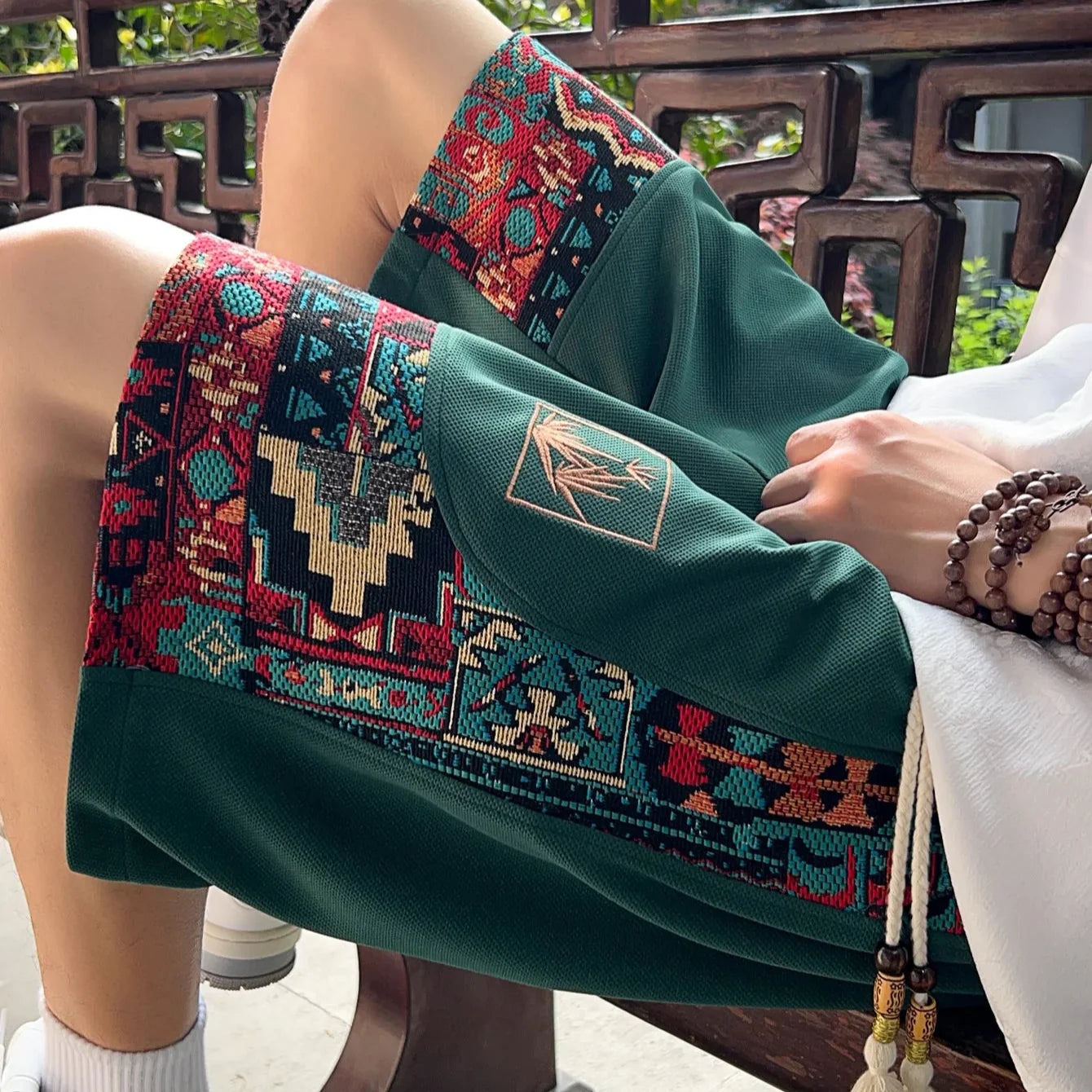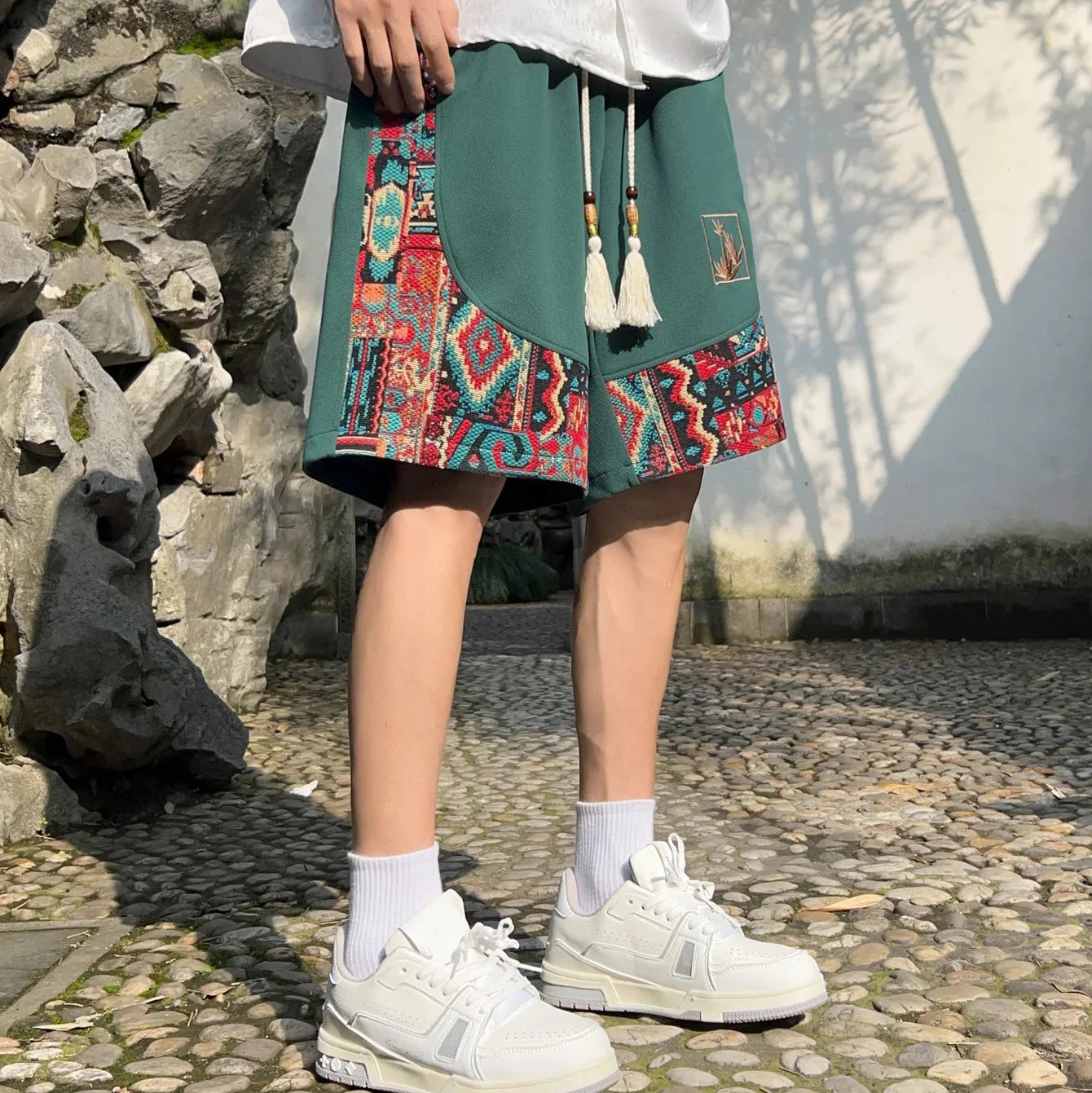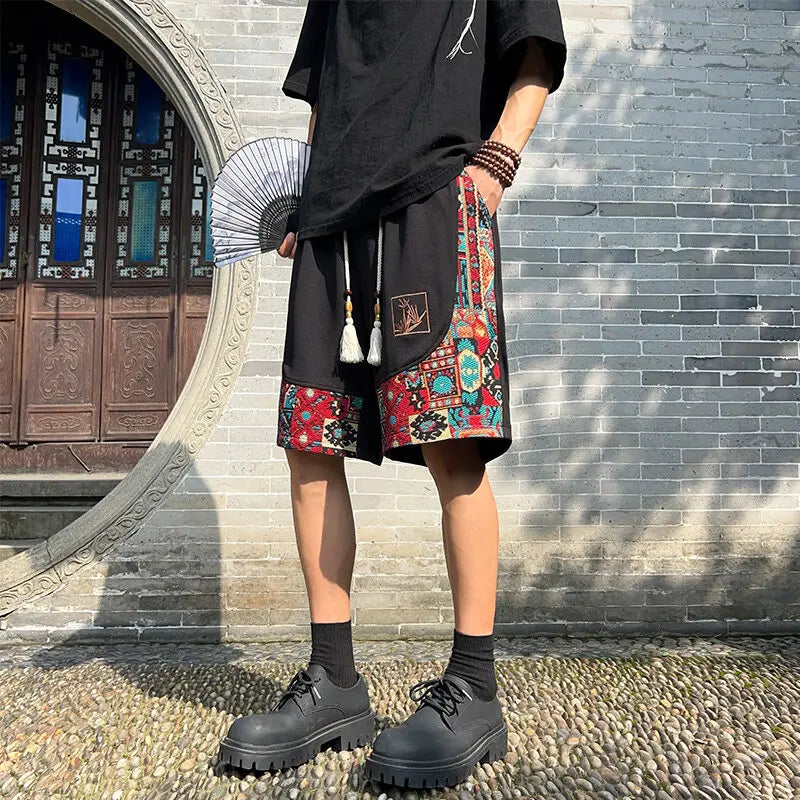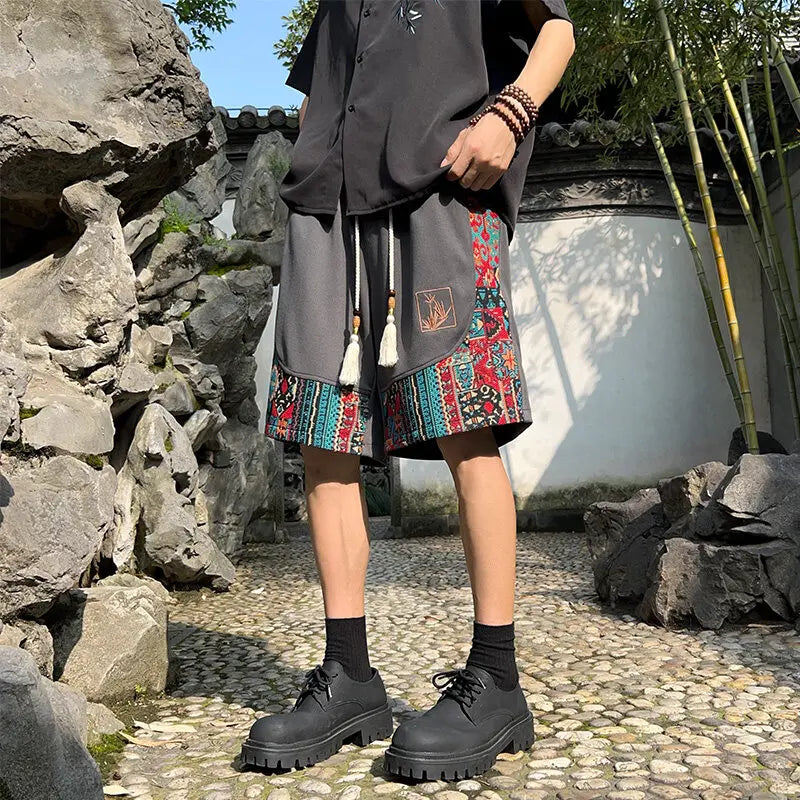 These shorts fuse modern streetwear with traditional artistry—featuring vibrant woven patchwork trim and intricate stitched patterns that pop with character.