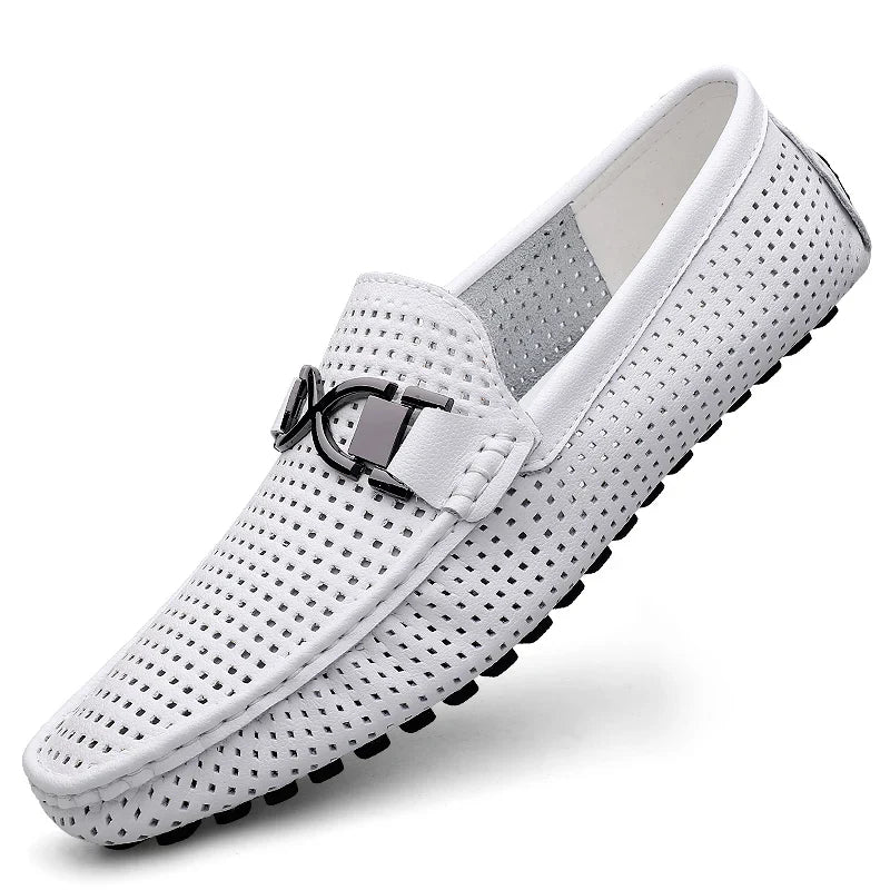 Refined and breathable, these perforated loafers blend Italian elegance with modern comfort. Finished with a sleek metal buckle, they're your go-to for effortless style and all-day ease.