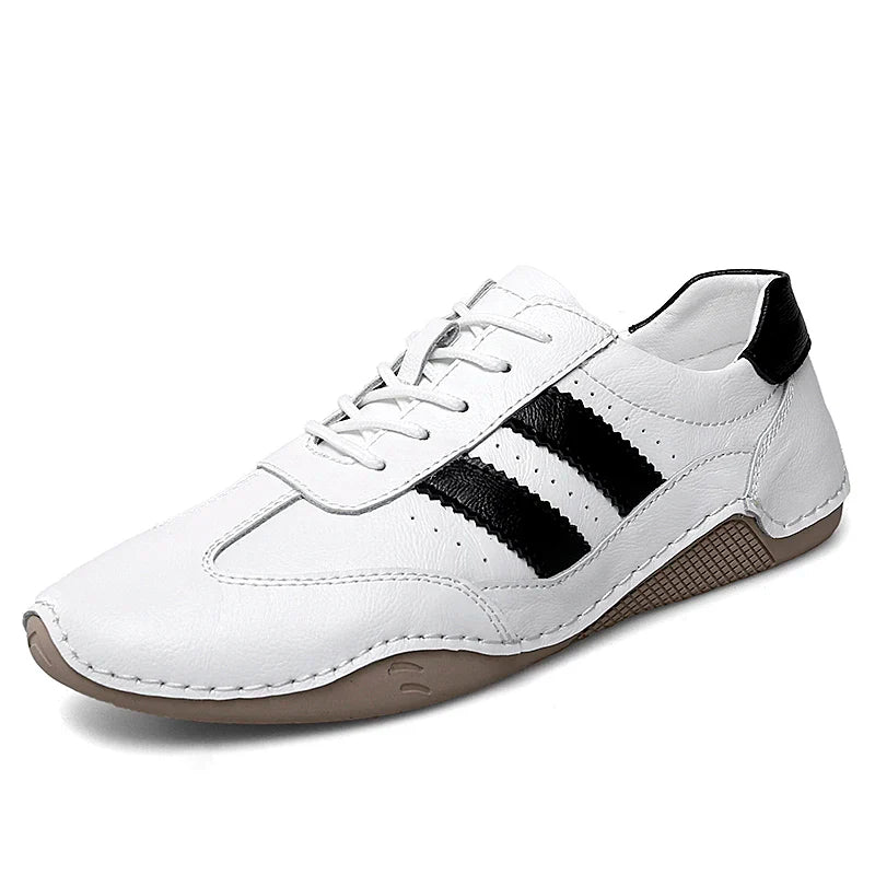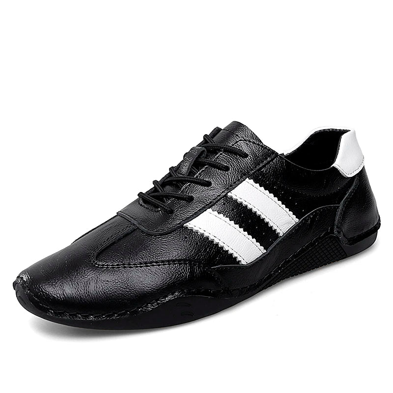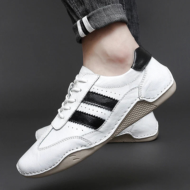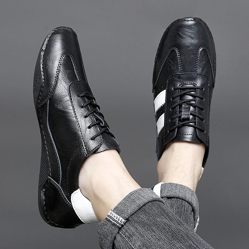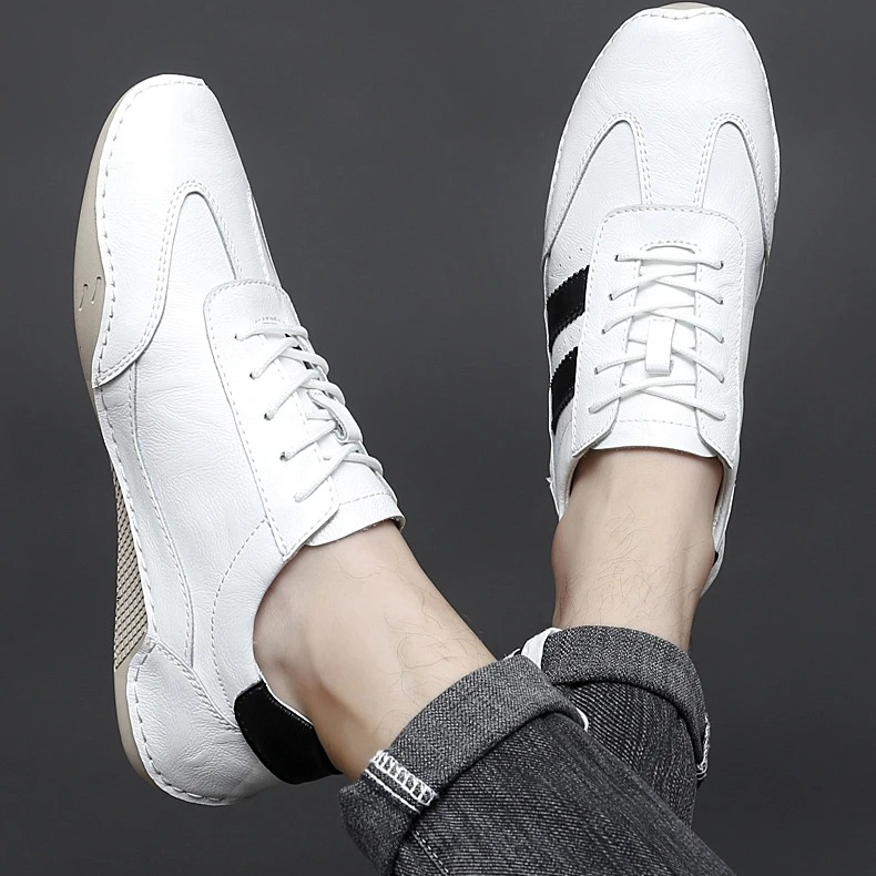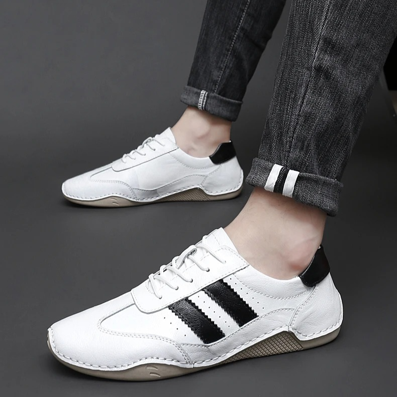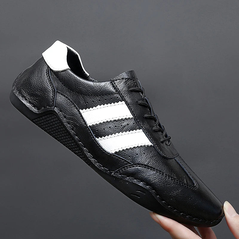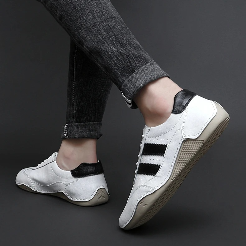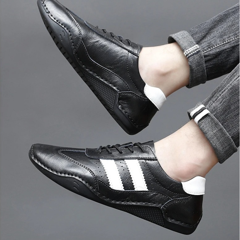 Built from genuine leather and styled with bold retro stripes, these sneakers fuse vintage sport aesthetics with modern streetwear attitude. The low-cut design, cushioned sole, and durable grip make them an easy go-to for daily wear with edge.