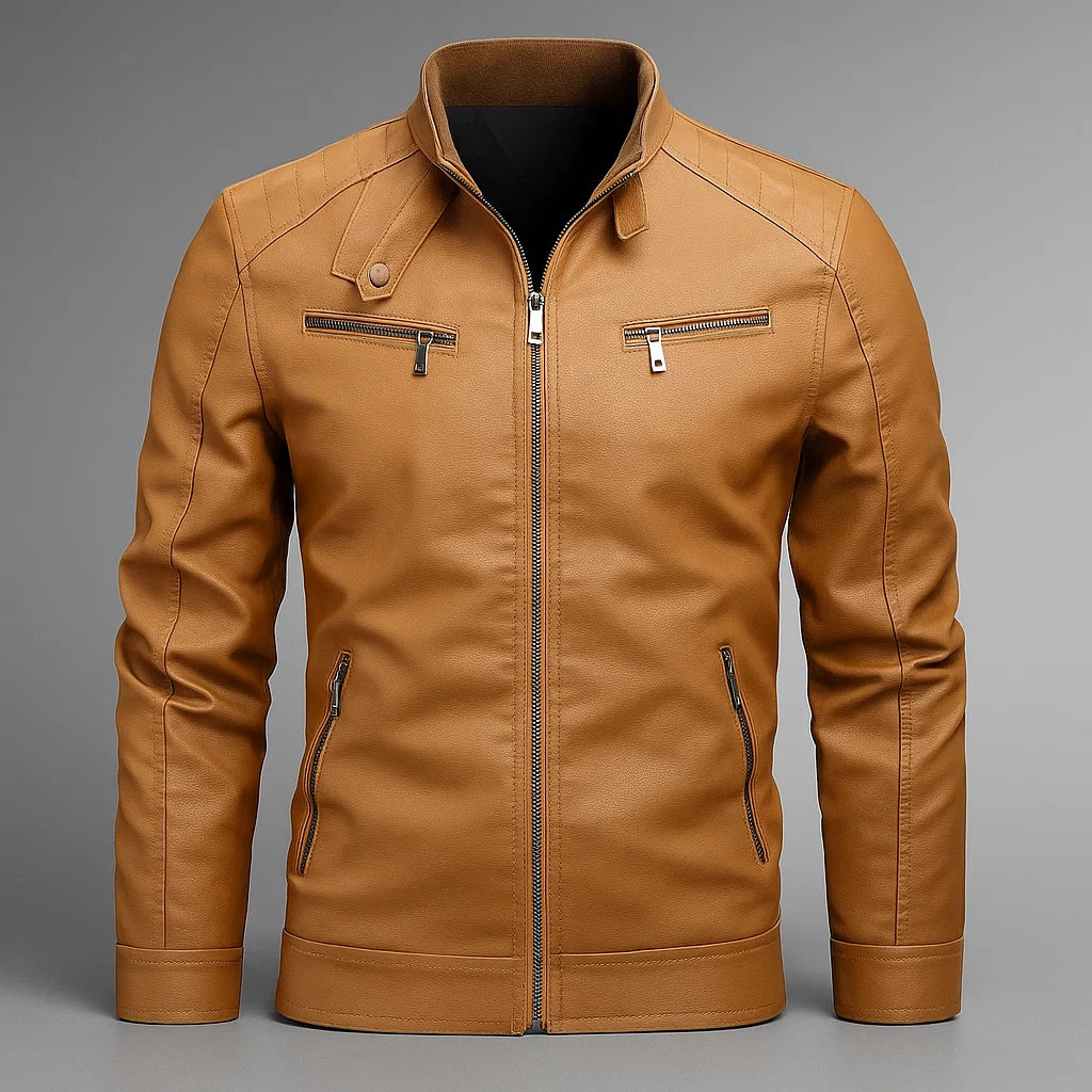 A modern moto-inspired leather jacket built to sharpen your entire look the moment you zip it up. Crafted from smooth, cruelty-free leather with detailed seam work and a structured stand-collar, it delivers everyday versatility with a bold, refined edge.