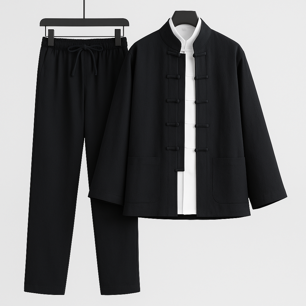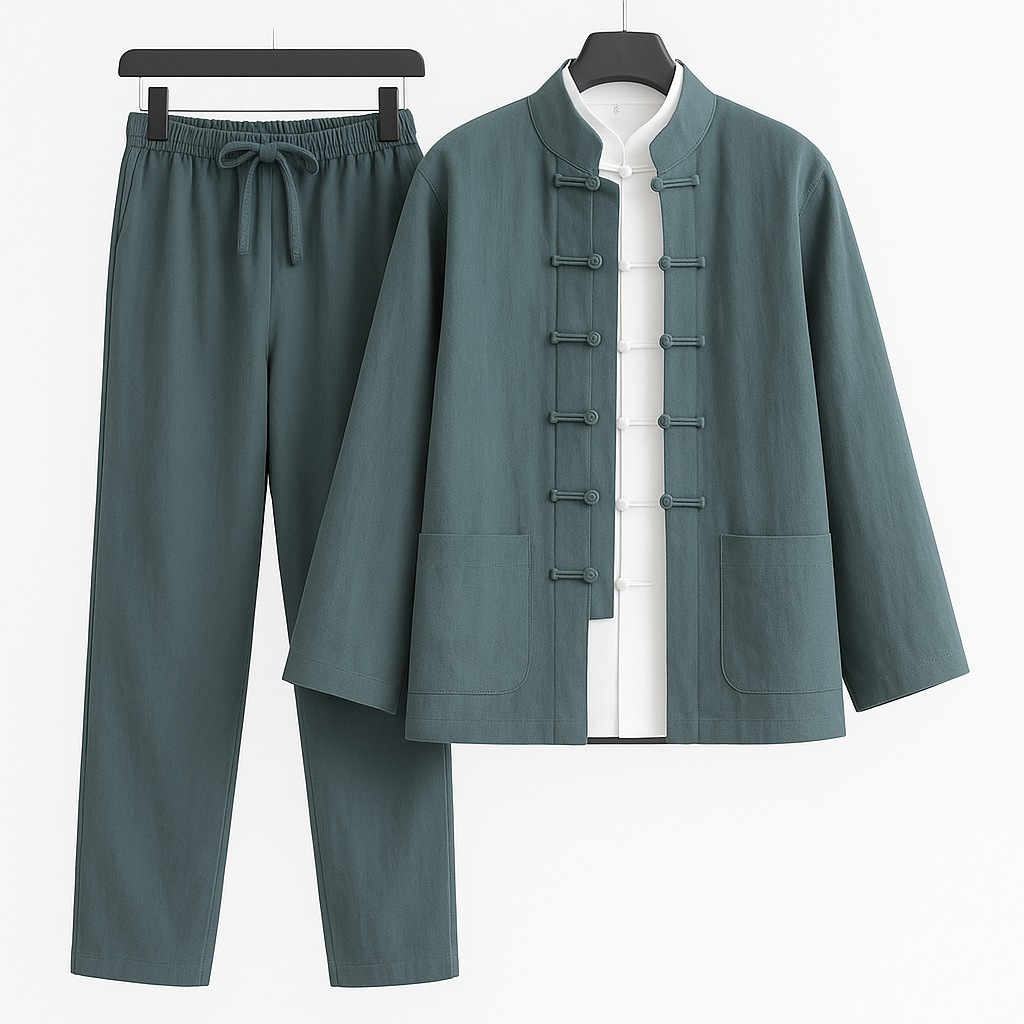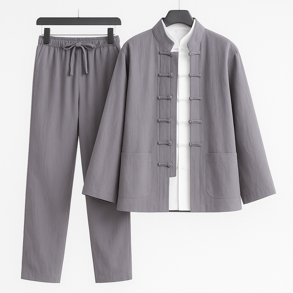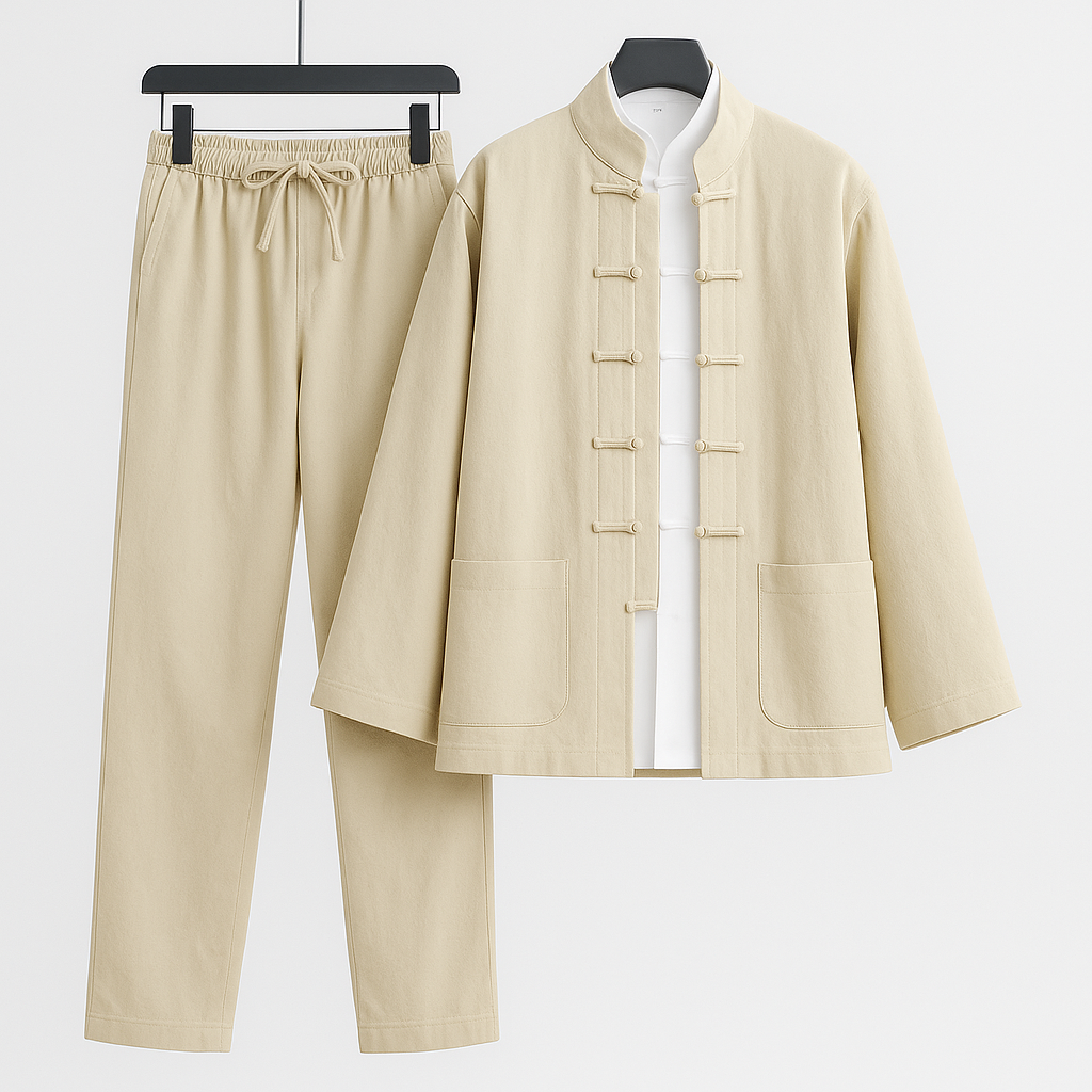 Crafted from a smooth, breathable cotton-linen blend, this two-piece set reimagines traditional wear. Featuring classic frog buttons, a soft Mandarin collar, and relaxed drawstring pants, it brings effortless elegance to warm days and laid-back evenings.