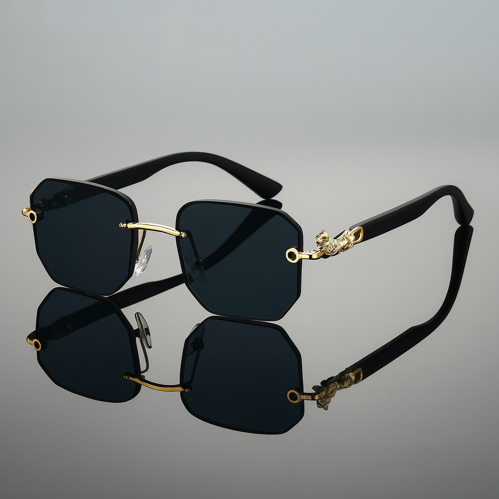 A bold take on rimless luxury, these sunglasses feature sculpted octagonal lenses paired with intricate gold dragon detailing on the temples. Designed for style, the gradient tints and marbled arms bring elegance and edge to every look.