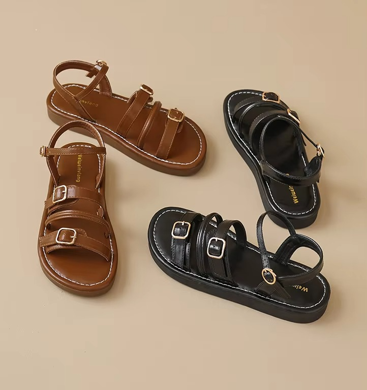 Step into timeless style and unbeatable comfort with these premium leather sandals. Designed with multiple straps and gleaming gold buckles, they offer a secure fit and day-long wearability, all while staying sleek with a flat sole and non-slip grip for confident strides.